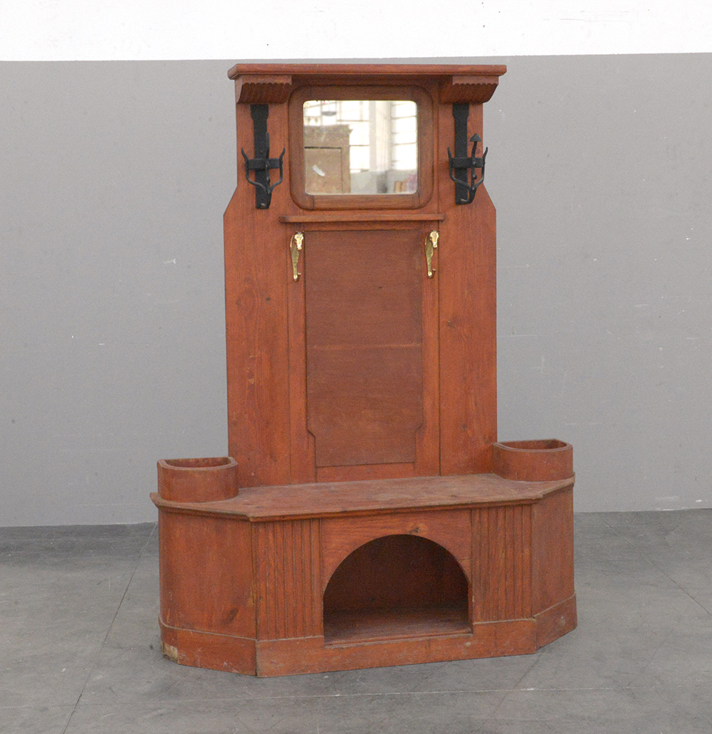 Attaccapanni in abete con panca e vani portaombrelli. Parte superiore con specchio, appendiabiti e portavasi in ferro battuto e ottone. Vano alla base. Italia, 1930ca. (cm 143x181x42) (difetti)
