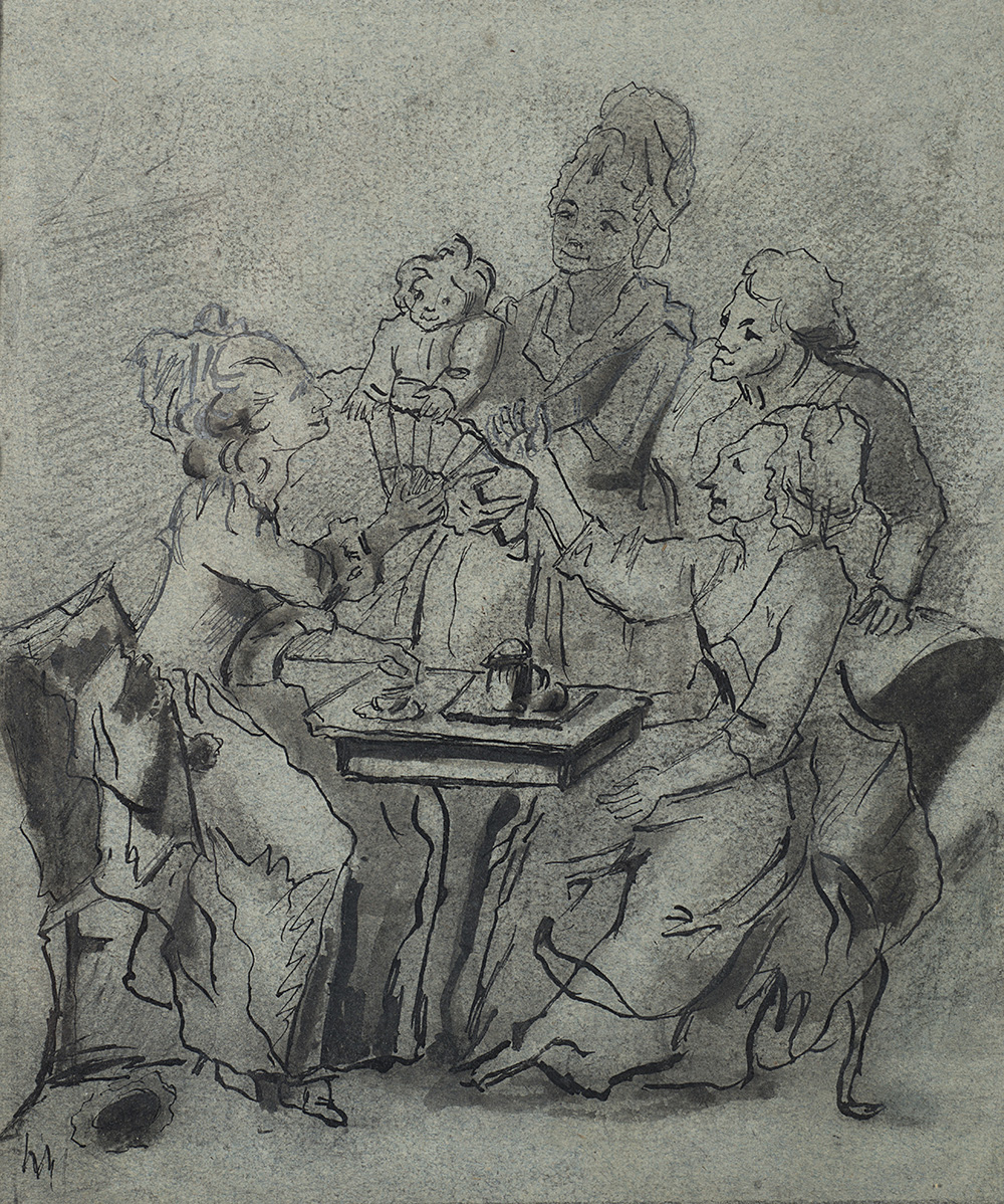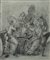 Scuola del secolo XIX "Scena d'interno" penna e inchiostro nero acquerellato in grigio su tracce a matita nera su carta azzurra (mm 264x222) In cornice
