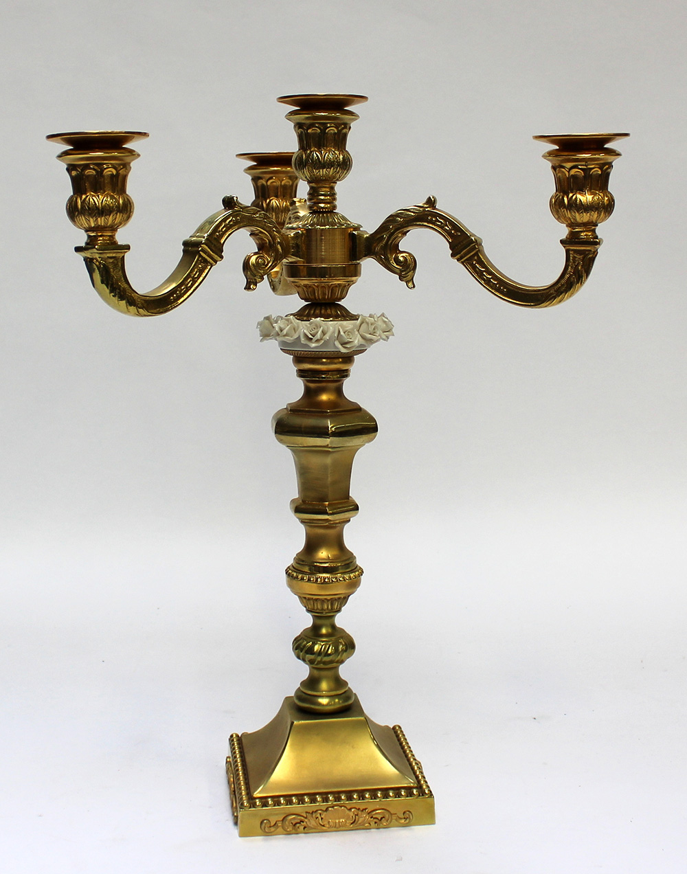 Candelabro a quattro fiamme in bronzo dorato decorato a volute e motivi floreali. Base quadrata a perlinature. Fusto decorato con inserto in ceramica a rose (h. cm 46)