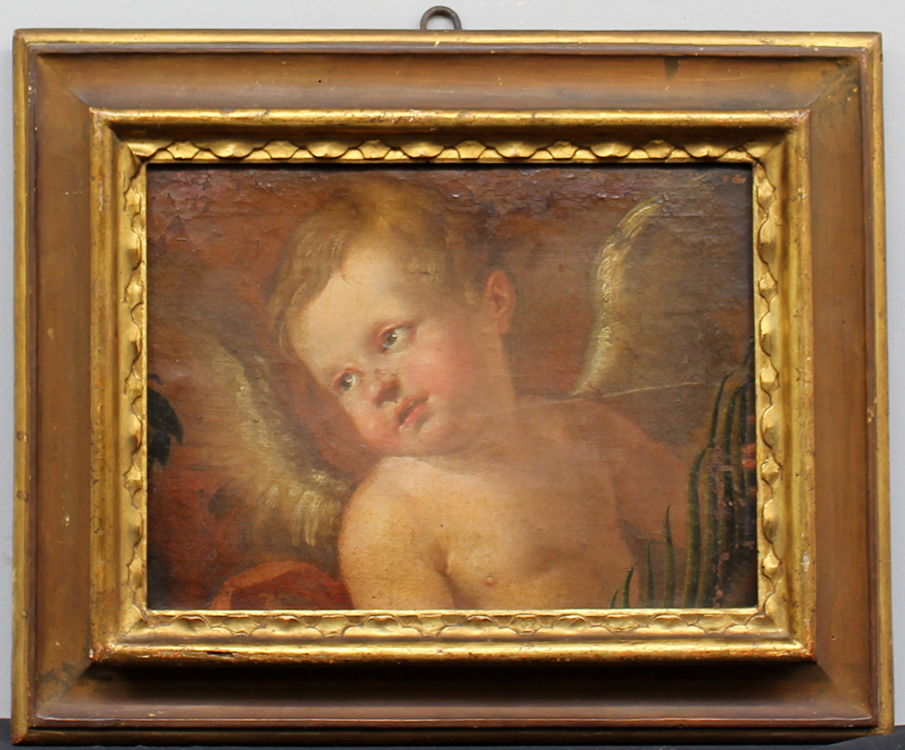 Scuola del secolo XVIII "Cherubino (frammento)" olio su tela applicata su cartoncino (cm 28x38) in cornice antica (difetti e mancanze)