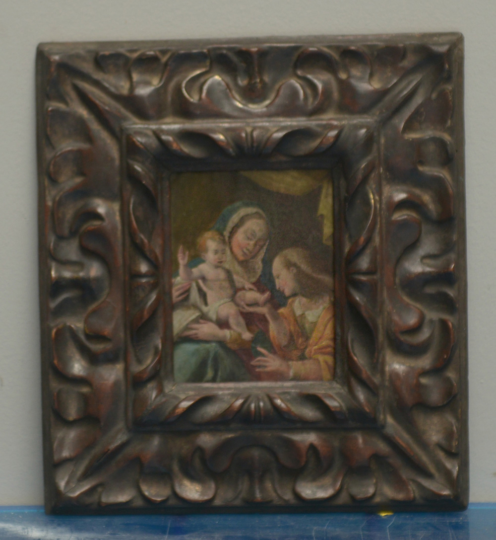 Ignoto "Sposalizio di Santa Caterina" olio su rame (cm 15,5x12,5) in cornice antica in legno intagliato (difetti)