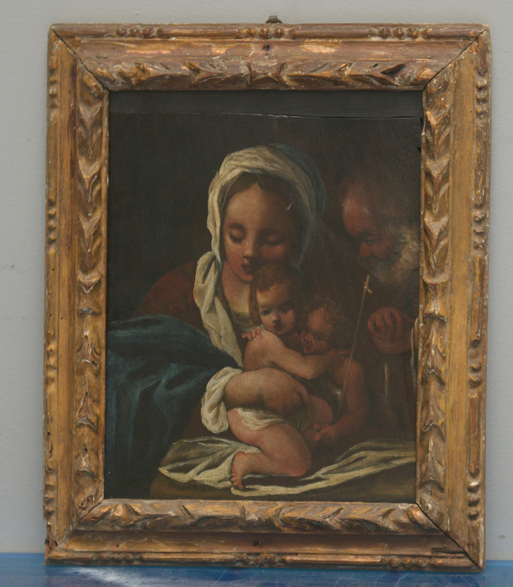 Da Bartolomeo Schedoni "Sacra famiglia con San Giovannino" olio su tavola (cm 32x26) in cornice in legno intagliato (difetti e restauri)
