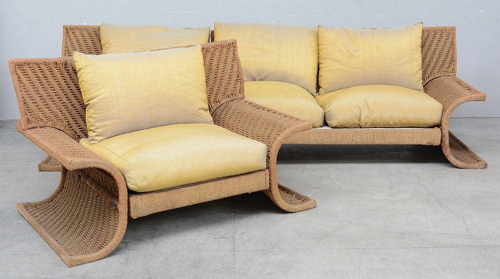 Forinitura composta da un divano a tre posti e una poltrona. Italia, anni '70. Cordone di passamaneria intrecciato e con struttura metallica e borchie di fissaggio in ottone tornito. (divano: cm 261x79x89; poltrona: cm 124x79x80) (difetti)