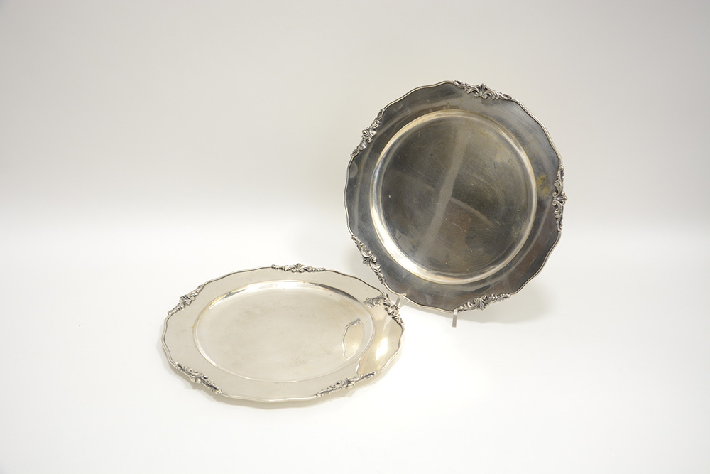 Lotto composto da due piatti in argento con decoro a motivi vegetali (g 1000 ca.)