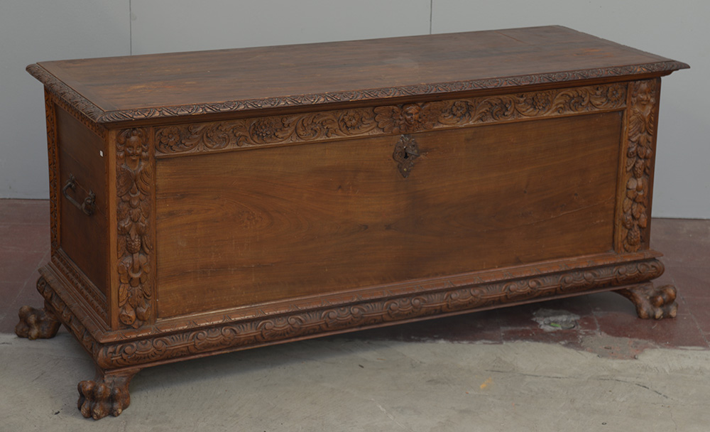Cassapanca in legno con fronte intagliato sui bordi a motivi vegetali, putti,...