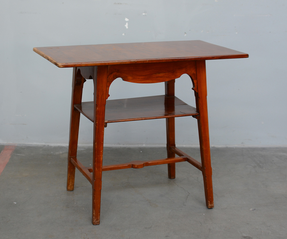 Tavolo di forma rettangolare in mogano a quattro gambe sagomate e riunite da pianetto e traverse dritte (cm 95x78x56) (difetti)