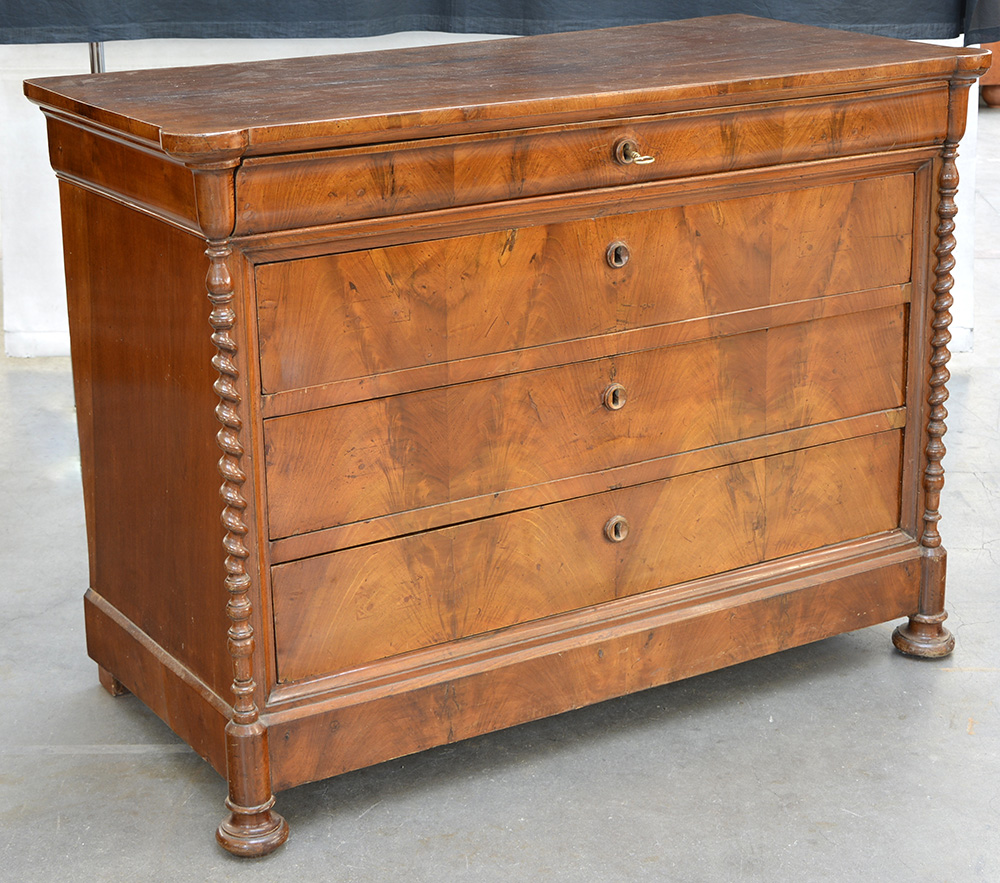 Comò in noce ad un cassetto piccolo sottopiano e tre grandi sul fronte. Montanti decorati a colonne tortili e con piedi a cipolla. Sec. XIX (cm 120x88x95)