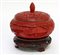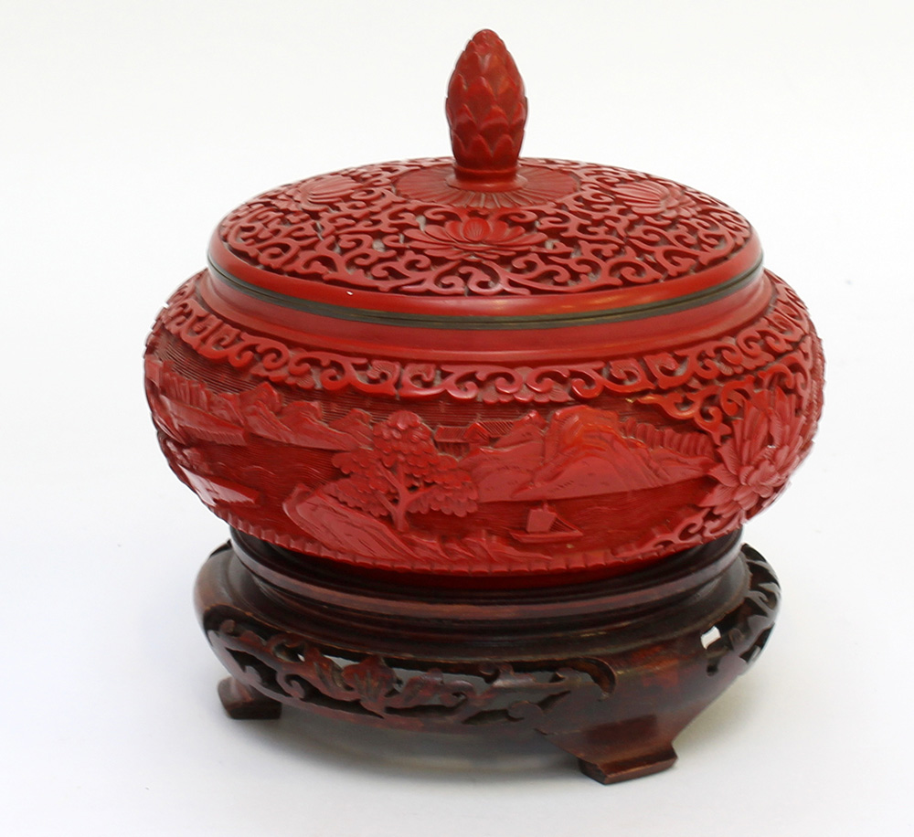 Lotto 1049 | Scatola circolare con coperchio intagliata con paesaggio nei toni del rosso...