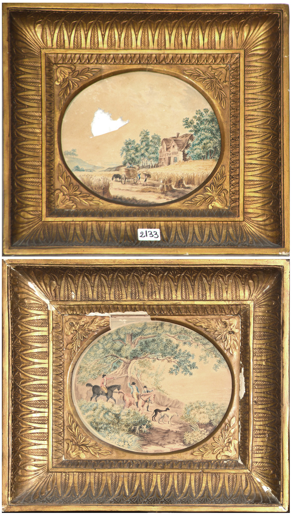 Scuola inglese, secolo XIX "Scena di caccia e paesaggio con contadini" coppia di acquerelli su carta (cm 17x20) In cornici coeve in legno e pastiglia dorata (difetti)