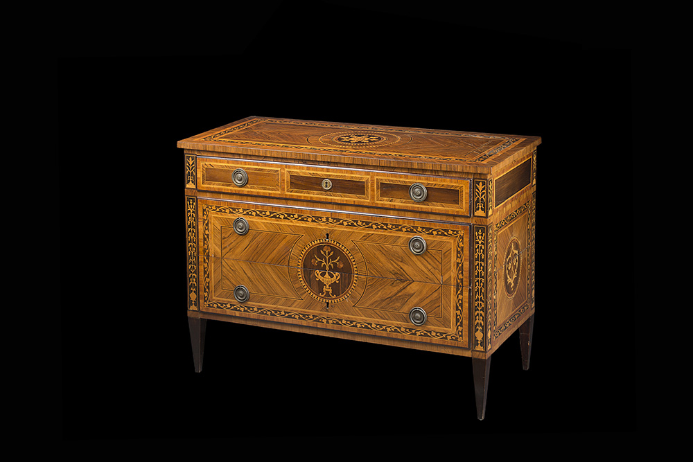 Cassettone a due cassetti e mezzo lastronato in noce e filettato in bois de rose e bois de violette. Piano, fianchi e fronte centrati da rosone con girali di foglie e fiori entro cornici a motivi vegetali stilizzati. Lombardia, secolo XVIII (cm 124x91x59,5) (difetti e restauri)
