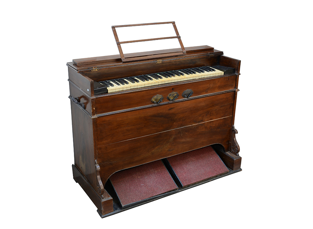Mobile in noce massiccio, 61 tasti , due pedali , tre registri (difetti e mancanze)