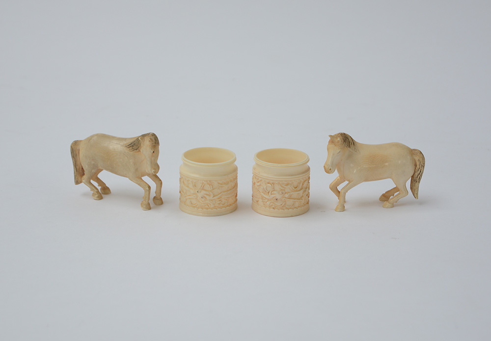 Lotto composto da due cavalli e due piccoli contenitori in avorio (difetti)