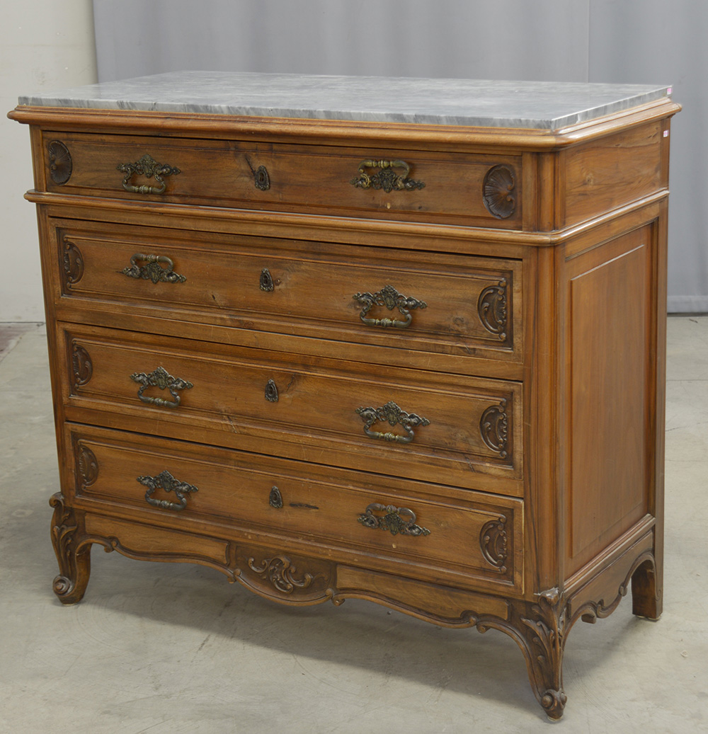 Comò a quattro cassetti intagliati a conchiglia, fascia e piedi sagomati ed intalgiati a motivi vegetali, piano in marmo grigio venato (cm 122x102x56)(difetti)