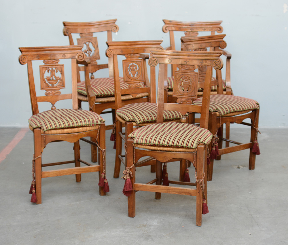 Fornitura per sala da pranzo composta da quattro sedie e due poltrone con schienale a cartelle mosse e traforate a delfini, alberi. Gambe dritte munite da traverse, secolo XIX (difetti e mancanze)