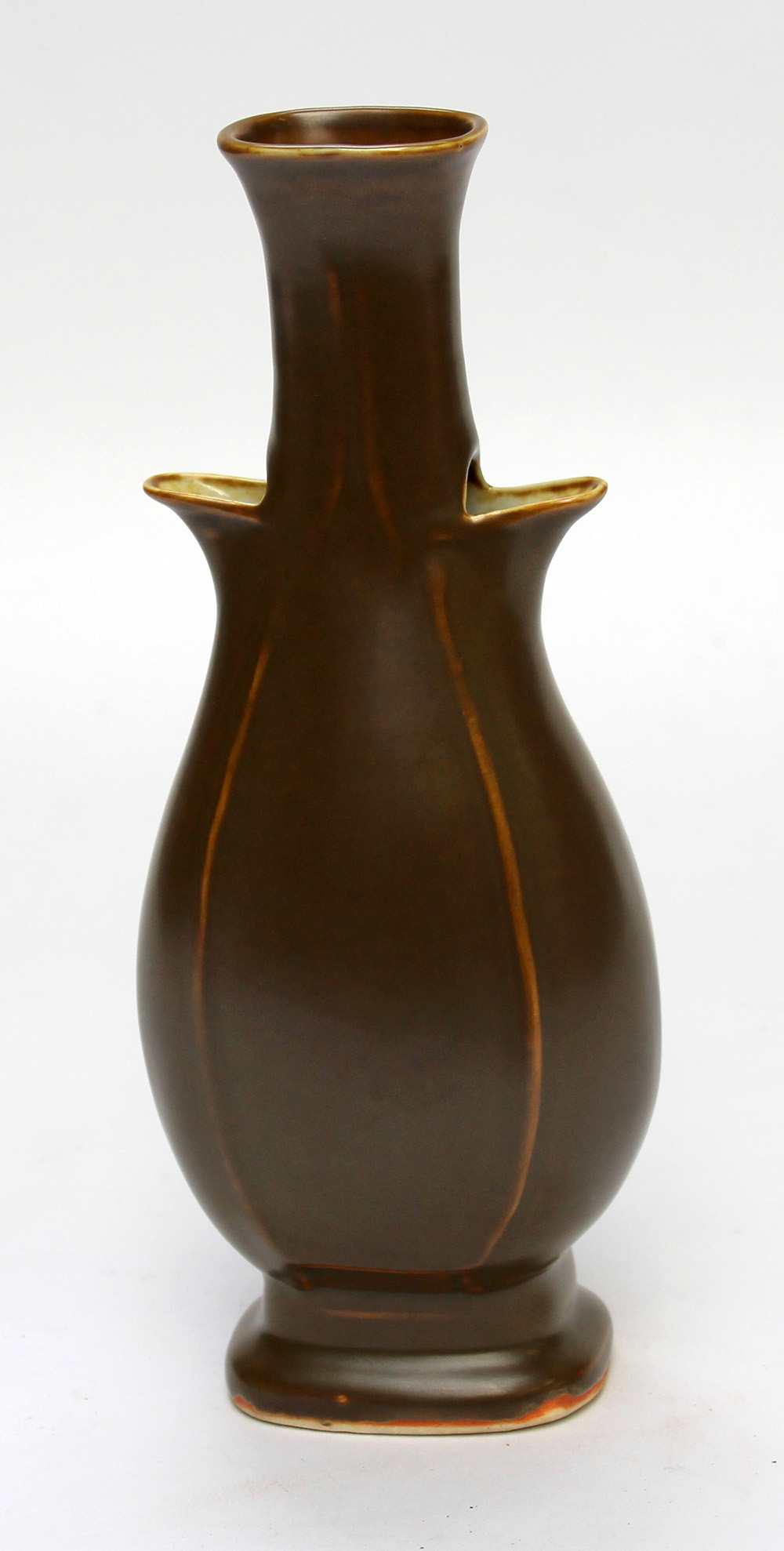 Vaso in porcellana con invetriatura "polvere di te" con due aperture alla base del collo (h cm 26,5) (lievi difetti)
