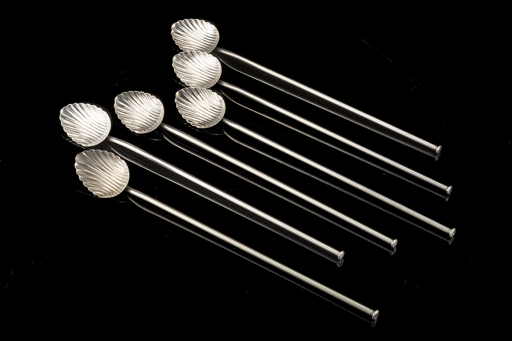 Gruppo di sei cannucce da cocktail in metallo argentato decorato a foglie stilizzate