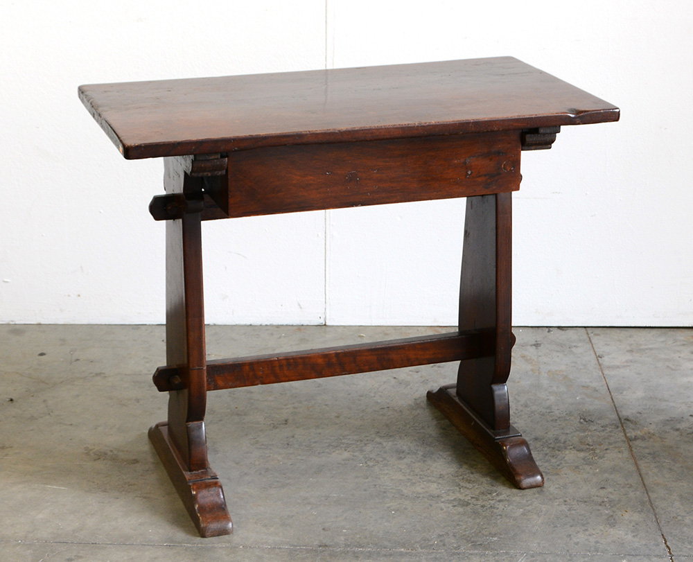 Antico tavolino ad un cassetto sottopiano, gambe sagomate riunite da traversa...