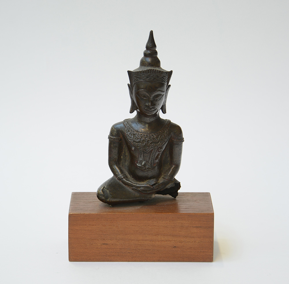 Buddha in bronzo in posizione seduta, base in legno (difetti e mancanze)