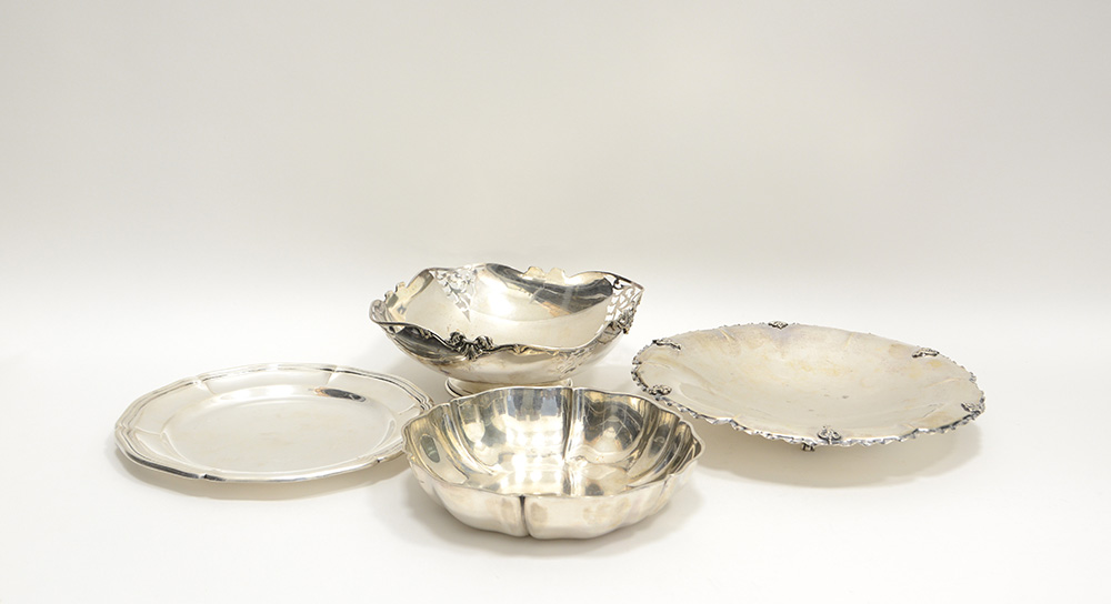 Lotto composto da due alzatine di forma e manifattura diversa, un piatto e un portadolci in argento (g 1000 ca.)