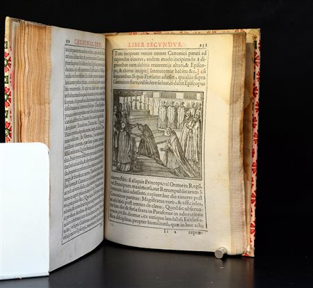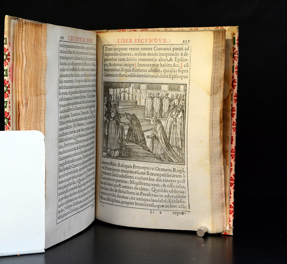 CERIMONIALE. Caeremoniale episcoporum iussu Clementis VIII. Roma: ex typographia linguarum externarum, 1600. 4to, delle varie segnature presenti in SBN questo: A4 A-Yy4 Zz2. Frontespizio in rosso e nero, numerose xilografie nel testo di cui alcune a piena pagina, notazione musicale stampata in rosso e nero, bei capilettera calcografici (macchie e gore nelle prime e ultime carte, qualche arrosstaura). Legatura moderna in mezza pergamena, tassello e titolo in oro al dorso, carta decorata ai piatti. Alcuni segni di provenienza al frontespizio