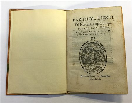 RICCI, Bartolomeo. De evitanda, atque compescenda iracundia, ad Iulium Cochium suum discipulum, libellus. Bologna: Peregrinus Bonardus, [1561]. 4to, marca tipografica incisa su legno sul frontespizio (arrossature, gora al margine inferiore, carte finali lievemente brunite). Legatura moderna in mezza pergamena, dorso a 3 nervi.