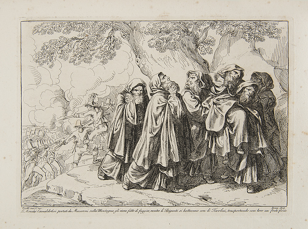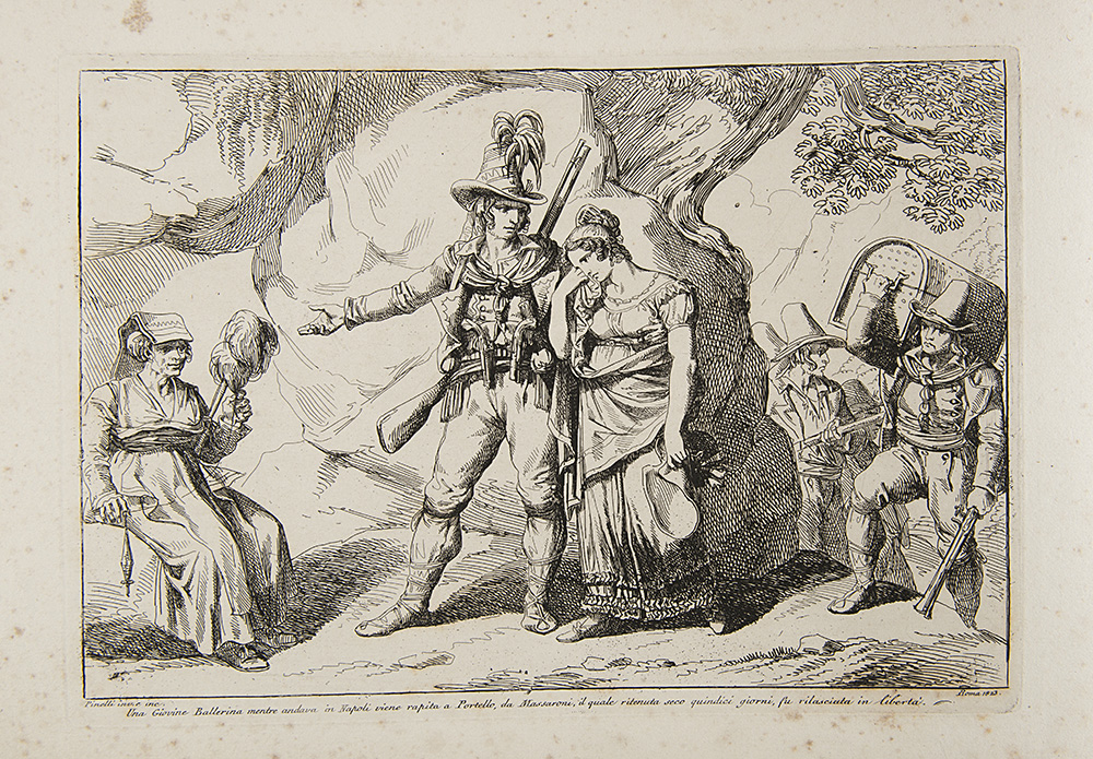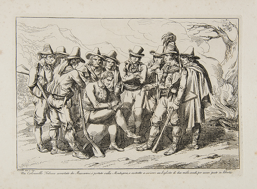 PINELLI, Bartolomeo (1771-1835) - Events of the Life of Massaroni, an Italian Bandit. Londra: Colnaghi and Co. Cockspur-Street, 1823. Raccolta di 10 incisioni in rame con scene della vita del bandito italiano Massaroni. 4to oblungo (270 x 430mm). Antiporta inciso in rame con ritratto del bandito Massaroni, 10 incisioni in rame alternate a didascalie descrittive in inglese (fioriture e lievi bruniture). Legatura cartonata e dorso in pelle (dorso gravemente compromesso con gravi mancanze, macchie e segni di usura).