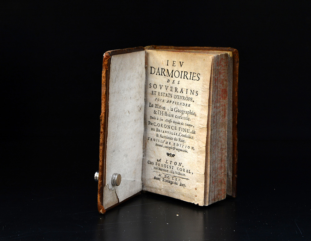 FINÉ DE BRIANVILLE O. Ieu d'Armoiries des Souverains et Estats d'Europe pour apprendre le blason, la géographie, et l'histoire curieuse. Lione, Benoist Coral, 1665. 16mo, rilegatura coeva in piena pelle (difetti). Curioso trattato di araldica che unisce nozioni di stoira e geografia. Raro
