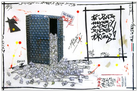 PETER HIDE 311065 (Franco Crugnola) Tradate 1965 Safe Project 2012 T.m. e collage su cartoncino 42 x 62. Data e firma + timbro studio dell’artista in b. a d., titolo e data al c.; sul resto dell’opera altre firme e scritte dell’artista. Autentica dell’autore su foto. Pubbl.: “To love money – Peter Hide – 311065” cat. mostra a cura di “Metamusa arte ed eventi culturali”, galleria Spazio Zero, Gallarate, 5 - 25 maggio 2012.