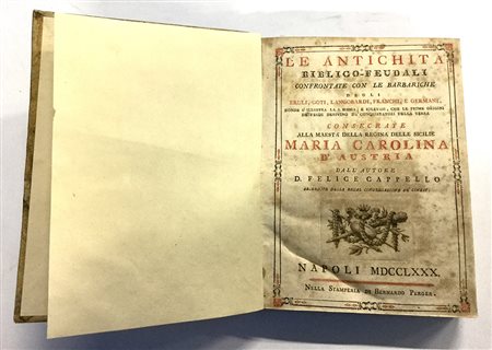 CAPPELLO, Felice. Le antichita biblico-feudali confrontate con le barbariche degli Eruli, Goti, Longobardi, Franchi e Germani. Napoli: Bernardo Perger, 1780. 8vo, frontespizio stampato in rosso e nero, vignetta incisa al frontespizio, armi di Maria Carolina in vignetta alla dedica, legatura in pergamena coeva. Esauriente trattato di questo studioso napoletano particolarmente versato nella scienza cavalleresca (lievi difetti)