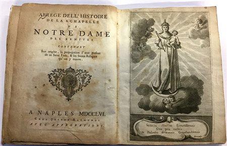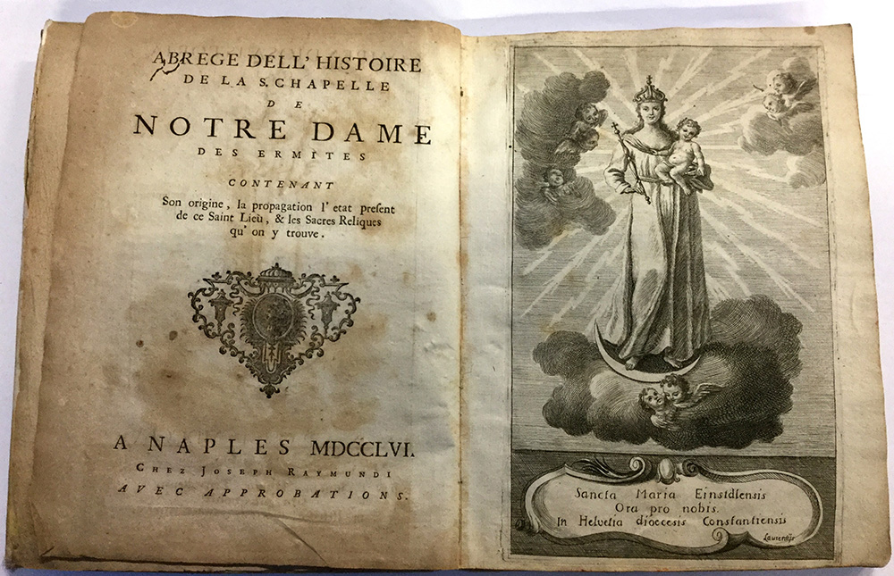 Compendiosa istoria della s. Cappella della B.V. Maria degli Romiti che contiene la sua origine, propagazione, lo stato presente di questo santo luogo, e le sacre reliquie che nel medesimo si trovano..Titolo parallelo :Abrege dell'histoire de la S. Chapelle de Notre Dame des Ermites. Napoli: Giuseppe Raimondi 1756. 4to; 1 tavola fuori testo incisa in rame con l’immagine della B.V. Maria che si trova in questa cappella nella Diocesi di Costanza in Svizzera. Legatura in pergamena coeva. Testo in italiano e in francese su colonne parallele. Il testo parla della vita di S.Conrado Vescovo di Costanza, di S. Meinrado,storia del Monastero di Einsidlen per mezzo dei santi Bennone ed Eberardo.