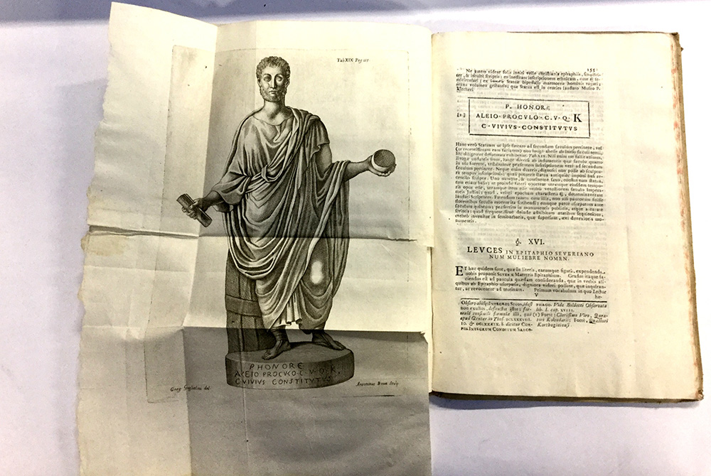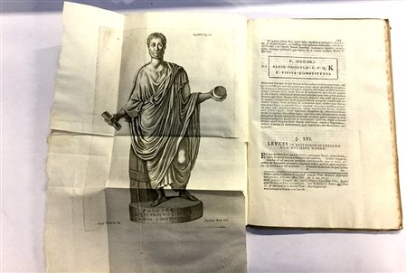 LUPI, Antonio Maria. Dissertatio et animadversiones ad nuper inventum severae Martyris Epitaphium. Panormi: Ex Typographia Stephani Amato, 1734. Folio, legatura coeva in pergamena, con titolo in oro su etichetta colorata al dorso, 15 tavole incise in rame fuori testo, molte tavole (alcune delle quali ripiegate più volte) incise in rame nel testo e diverse xilografie e disegni. Le tavole sono tutte incise da Antonio Bova su disegno di Gregorio Guglielmi.Bellissima vignetta incisa in rame a mezza pagina al frontespizio che rappresenta un trofeo con le Armi del dedicatario. Bella copia
