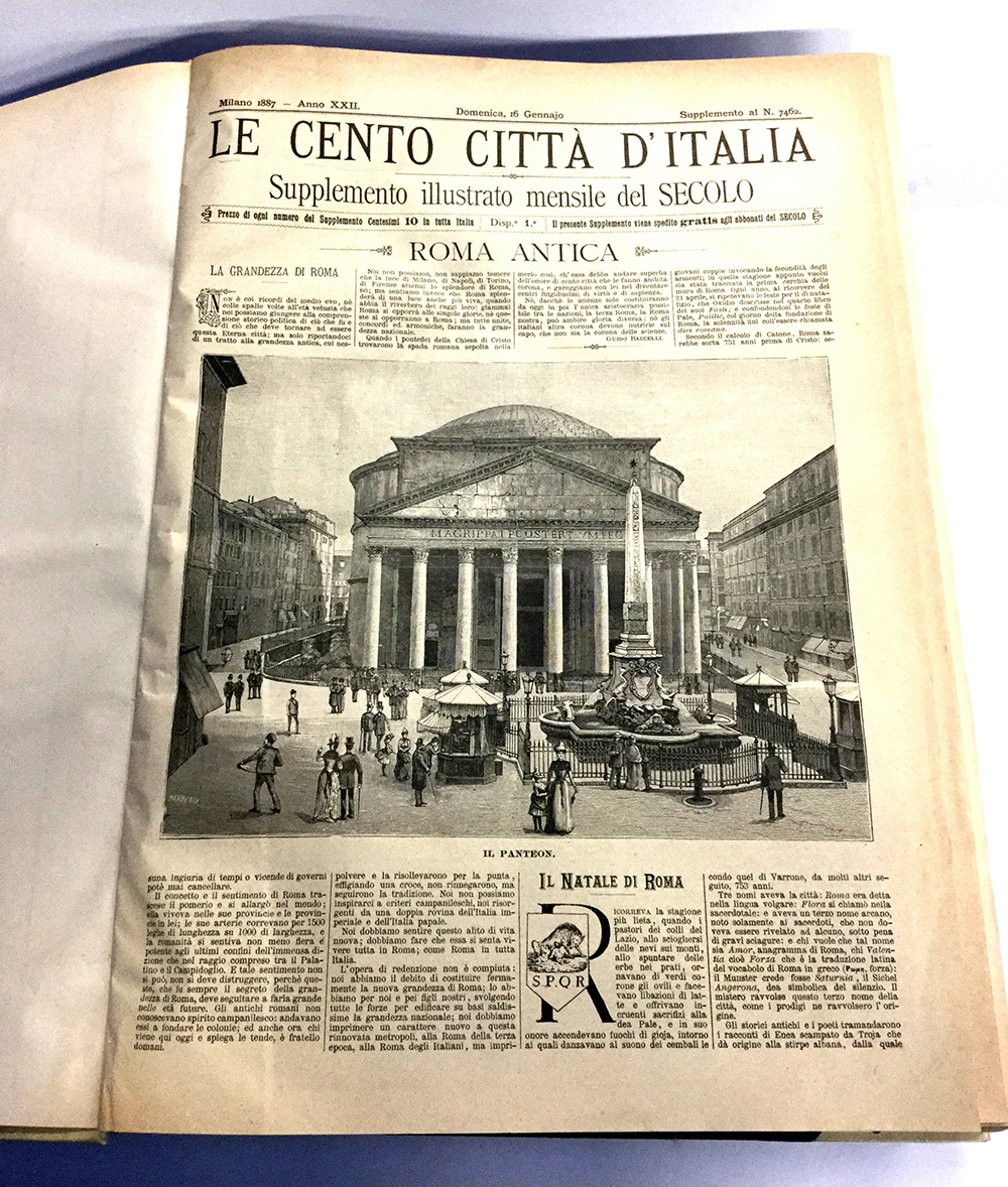 Le cento città d'Italia. Supplemento illustrato mensile del Secolo. Milano: Sonzogno, 1887-1902. Folio (mm.430x300) serie completa di 192 fascicoli rilegati in due tomi in mezza pergamena con punte, titolo e fregi al dorso. Nota pubblicazione a diffusione popolare che uscì mensilmente, come supplemento del Secolo, dal 1887 al 1902. Ogni fascicolo, di 8 pp., è corredato da piccole e grandi xilografie intercalate nel testo: monumenti, piazze, scorci di città, edifici e loro particolari. Edoardo Sonzogno fondò, a Milano, nel 1866 il quotidiano “Il Secolo” che fu il primo quotidiano italiano nel senso moderno del termine: a differenza dei fogli già esistenti, che contavano sull'adesione politica dei propri lettori, il nuovo quotidiano si prefisse di assumere una posizione di terzietà rispetto ai fatti. Puntò tutto sulla fattura delle notizie, cercando di distinguersi per la tempestività dei servizi di cronaca e anche con l’ausilio di un proprio servizio telegrafico divenne nel 1883 il giornale più letto d’Italia con 100.000 copie vendute. Nel 1887 venne lanciata una grande iniziativa editoriale: Le Cento città d'Italia, enciclopedia a fascicoli in uscita ogni mese, in abbinamento col quotidiano. Le uscite si protrassero ininterrottamente per 15 anni per un totale di 192 numeri. Ogni fascicolo costava 10 centesimi (gratis per gli abbonati). Pur avendo un intento ed uno stile divulgativi, la collana si avvalse anche di scrittori del calibro di Cesare Cantù e Grazia Deledda, oltre a uno stuolo di esperti locali. Esemplare in ottimostato di conservazione.
