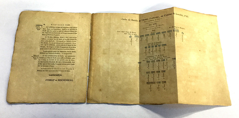 Combat* de Lowositz en Bohéme. DresdA: aux dépens de l'éditeur, 1778. 4to, 2 grandi tavole più volte ripiegate con l’ordine di battaglia delle truppe prussiane e quelle delle truppe imperiali austriache alla battaglia nel 1756. Esemplare facente parte dell’opera più vasta (Des Relations & plans des batailles & combats de la Guerre de 1756, à 1763, en Allemagne. Première partie, qui contient toutes les actions arrivées pendant les deux campagnes, 1756 & 1757. Savoir, celle de Lowositz). In buono stato (bruniture per la qualità della carta, lievi difetti).