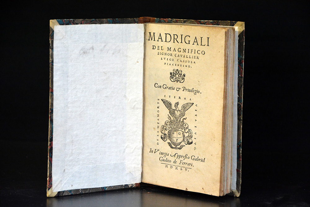 CASSOLA Piacentino Luigi, Madrigali, Venezia, Giolito de Ferrari 1545. Legatura del sec XIX, dorso in pelle e piatti marmorizzati. (difetti)
