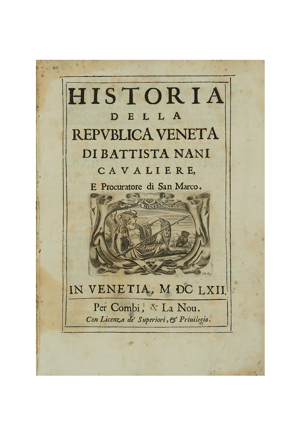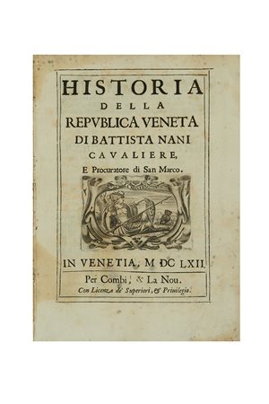 NANI, Giovan Battista (1616-1678) - Historia della Republica Veneta. Venezia: Combi e La Nou, 1662. Prima edizione di questa apprezzata e stimata storia di Venezia. 4to (261 x 190mm). Marca tipografica in rame raffigurante la Minerva al frontespizio, capilettera figurati xilografici e fregi (senza ultima bianca, tracce di umidità alle prime carte). Pergamena coeva tinta di rosso, parte di etichetta al dorso, tagli rossi (alcune tracce di umidità e difetti). Provenienza: Demeaulx (iscrizione datata 1664).