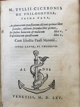 CICERONE, Marco Tullio. De Philosophia. Venezia: Aldo Manuzio, 1565. Vol. in 8vo, con marca tipografica al frontespizio (lievi macchie di umidità ai margini). Legatura in piena pergamena (lievi difetti).