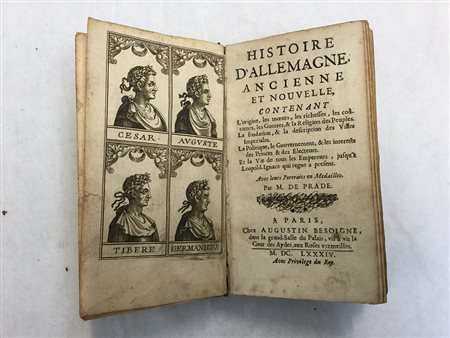 DE PRADE, Jean Royer. Histoire d'Allemagne, ancienne et nouvelle. Parigi: Agostino Besoigne, 1684. Vol. in 8vo, con incisione in antiporta (difetti). Legatura in piena pelle con decorazioni in oro al dorso (lievi difetti).