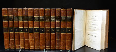 GIBBON, Edward. The history of the decline and fall of the Roman Empire. A new edition. Basilea, Tourneisen, 1788-89. 14 voll in 8vo, cartine geografiche al primo volume. Legatura coeva in mezza pelle, dorso dorato. (difetti)