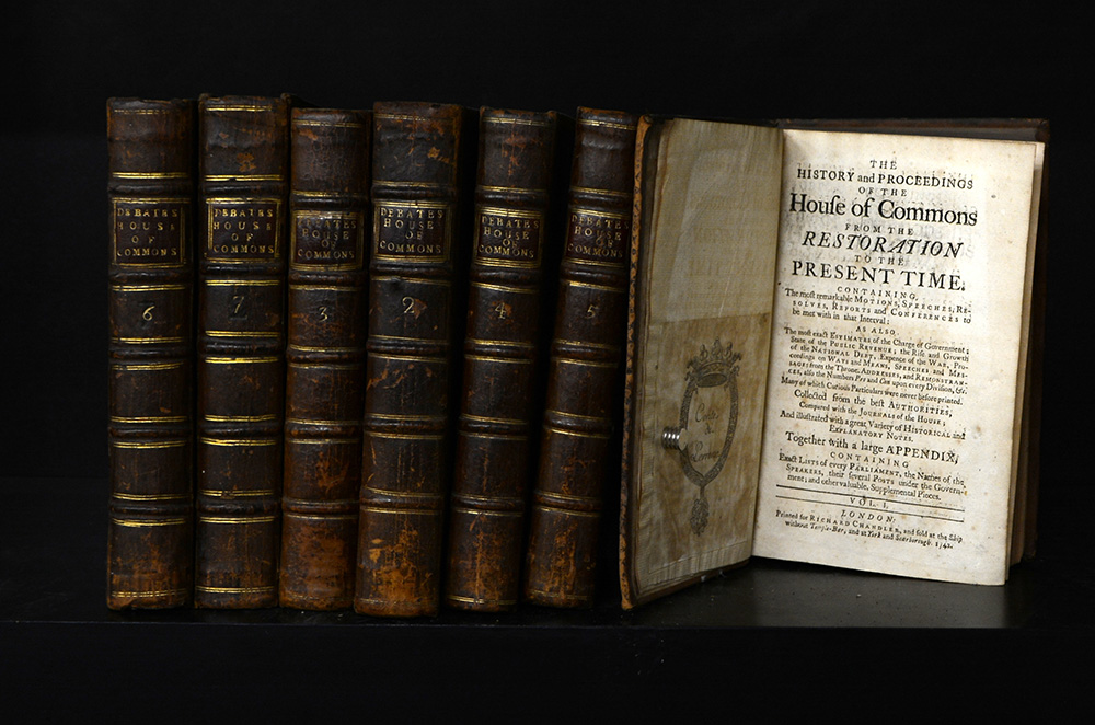 CAMERA DEI COMUNI. Serie di volumi del The History and Proceedings of the House of Commons from the Restoration to the Present Time. Londra: 1742-41. 7 volumi in 8vo, pelle coeva, dorature (lievi difetti)