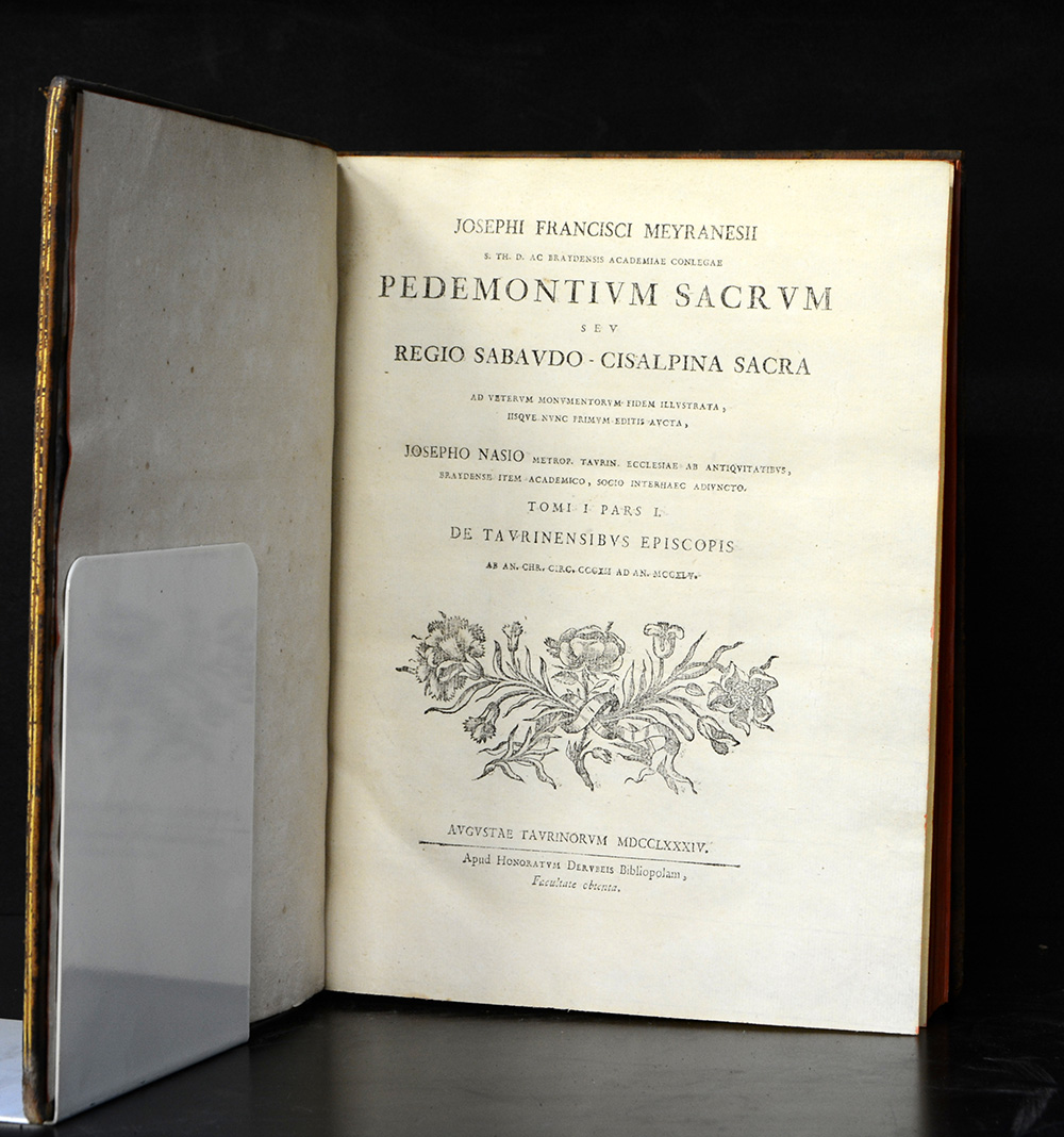 MEYRANESIO Giuseppe Francesco, Pedemontium Sacrum seu Regio Sabaudo. Torino, De Rubeis, 1784. Tomo uno parte prima (unica pubblicata) 4to, pelle coeva, dorso in oro, tagli rossi. Internamente in buone condizioni, lievi difetti alla legatura