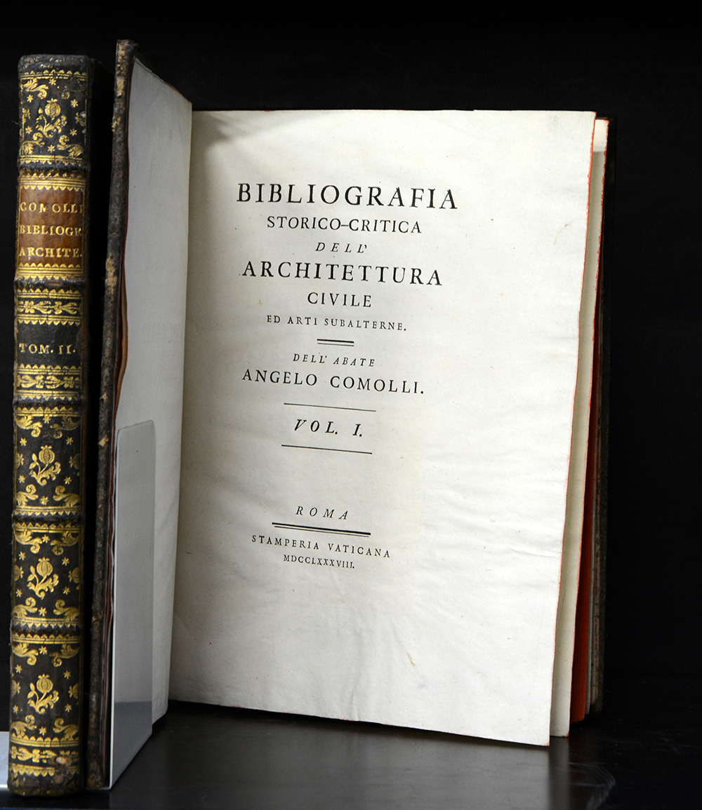 COMOLLI, Angelo Giovanni, Bibliografia storico-critica dell'architettura civile ed arti subalterne. Roma: Stamperia Vaticana, 1788. 2 voll (di 4) in 4to. Legatura coeva, dorso in pelle dorato, tagli rossi. Internamente in buone condizioni, lievi difetti alla legatura.