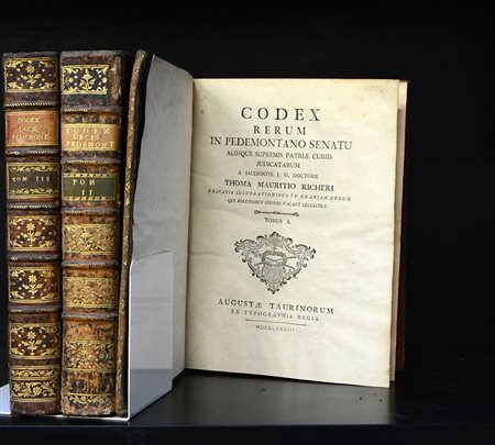 RICHERI, Tommaso Maurizio. Codex rerum in Pedemontano Senatu. Torino, Tipografia Regia, 1783-1785. 3 voll (di 4) , in 4to. Piena pelle a spruzzo, dorso in oro, tagli rossi.
