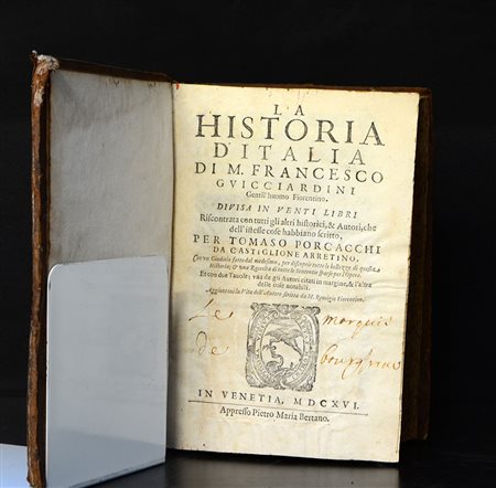 GUICCIARDINI, La Historia d'Italia. Venezia: Pietro Maria Bertano, 1616. Un volume in 4to, piena pelle coeva, dorso in oro, tagli a spruzzo. internamente buoni condizioni, difetti alla legatura