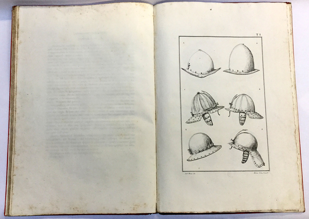 UBOLDO A. Descrizione degli elmi posseduti da Ambrogio Uboldo. Milano: Molina, 1840. Folio grande, tavole litografiche. Rilegatura coeva in tela arancione decorata in oro. alcuni difetti.