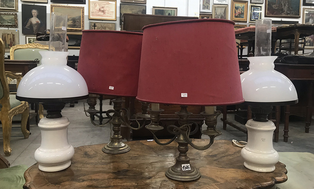 Lotto composto da una coppia di abat-jour a due fiamme in rame ed una coppia di lampade a petrolio in ceramica e opaline, montate a luce elettrica (difetti)