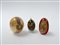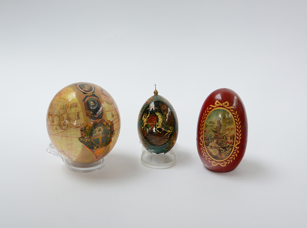 Lotto 1686 | Lotto di tre uova in legno di misure e decori diversi (lievi difetti)