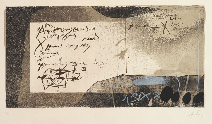 Antoni Tàpies Barcellona 1923 - 2012 Manuscript Acquaforte e acquatinta a colori, es. 14/50, cm. 35,8x69,1 (lastra), cm. 65x93 (carta) Firma a matita sul margine in basso a destra: Tàpies, in basso a sinistra tiratura: 14/50.
