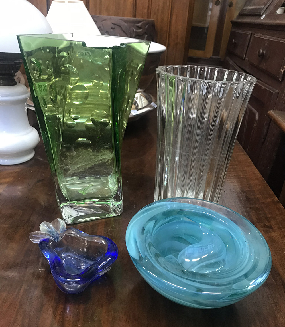 Lotto composto da una ciotola in vetro sommerso della manifattura di Kosta Boda, due vasi ed un posacenere in vetro e cristallo di diverse manifatture (difetti)