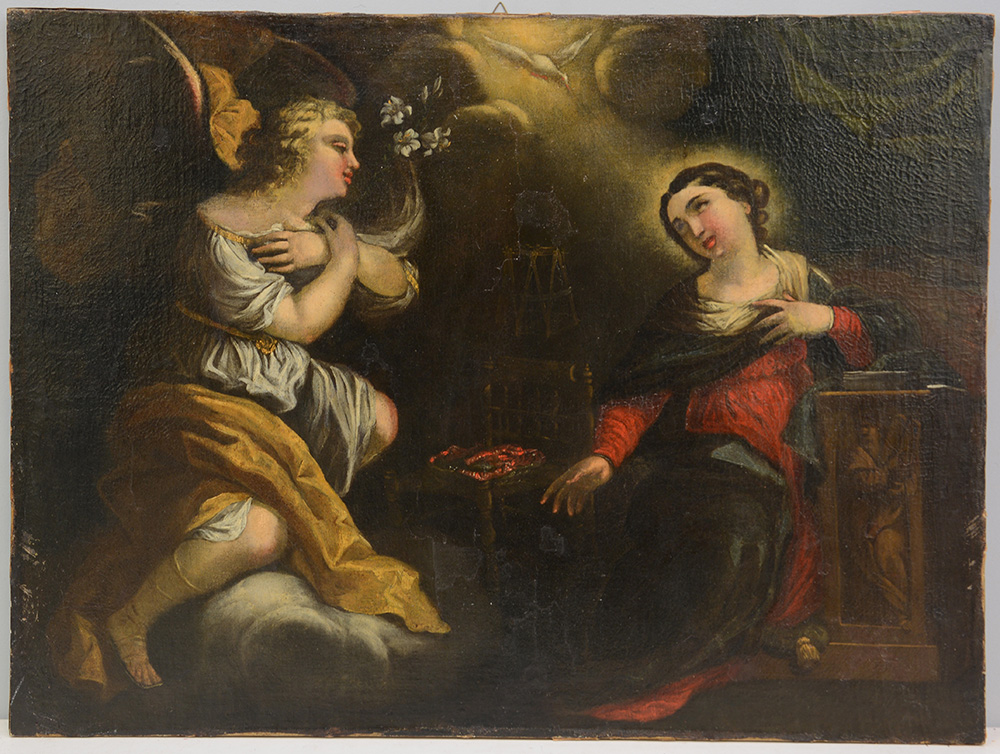 Scuola veneta del secolo XVII "Annunciazione" olio su tela (cm 74x100) (difetti e restauri)