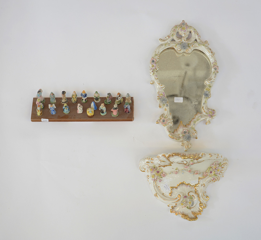 Lotto composto da una mensolina con specchio in porcellana decorata a...